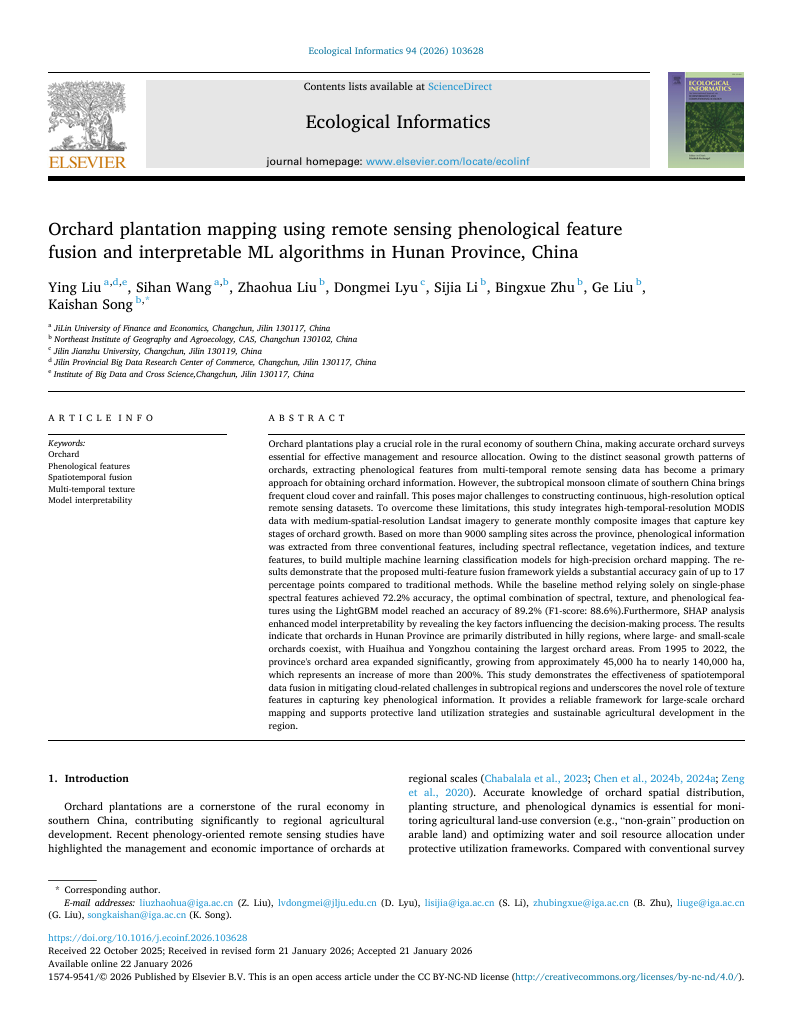 喜报!我院管理科学与工程专业2023级研究生王思瀚的学术论文《Orchard plantation mapping using remote sensing phenological feature fusion and interpretable ML algorithms in Hunan Province, China》于2026年1月成功发表于中国科学院环境科学与生态学二区期刊Ecological Informatics。